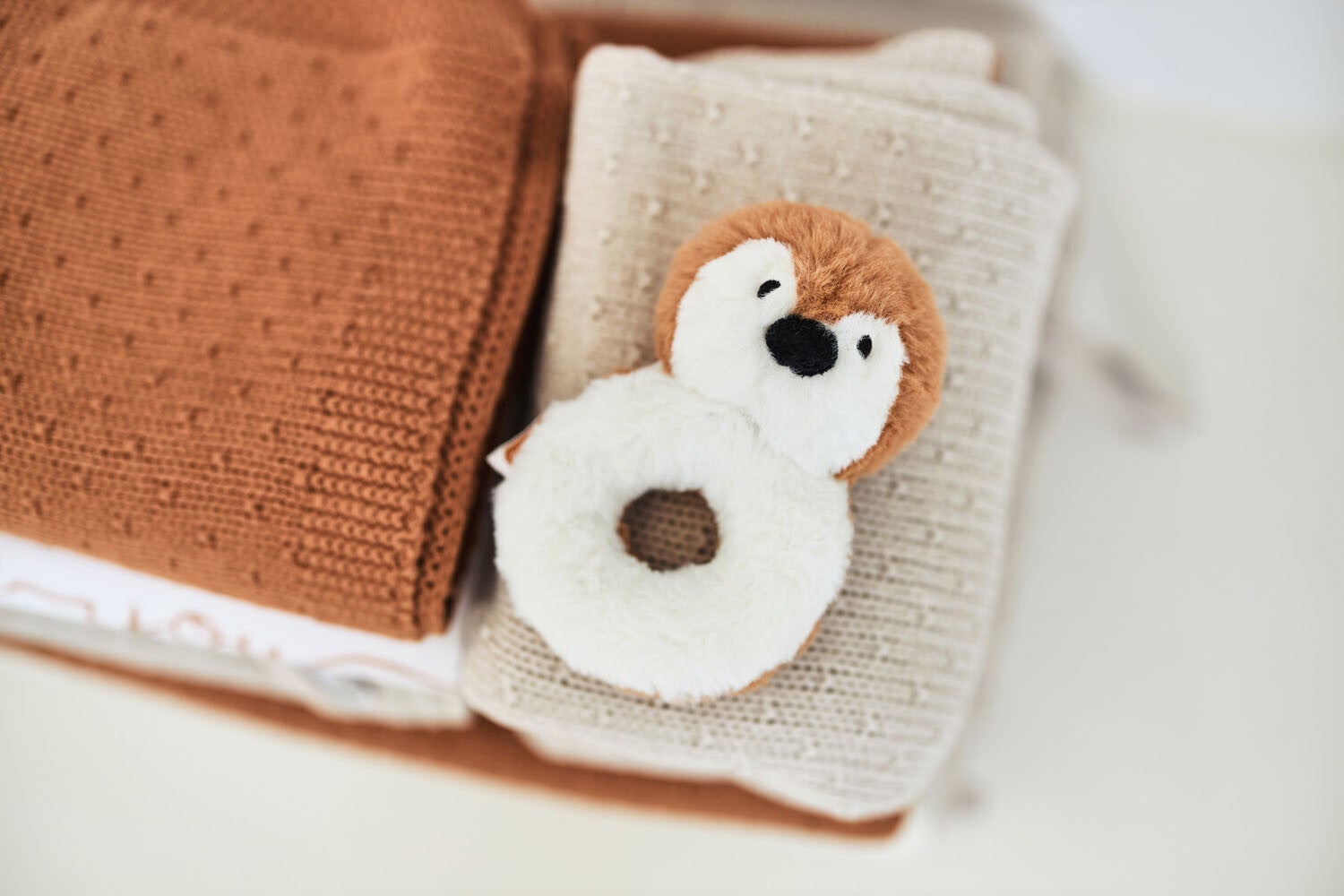 Dit lieve pinguïn vriendje is heerlijk zacht en ook nog eens leuk om mee te spelen. Oefen met grijpen naar de rammelaar. Of schud de rammelaar heen en weer zodat het belletje in de pinguin een zacht geluidje maakt. Dit stimuleert de baby om te bewegen. De pluchen rammelaar is gemaakt van zachte pluche en 13 cm groot. De pinguïn rammelaar is verkrijgbaar in de kleur caramel en grijs. Leuk om als kraamcadeau te geven.